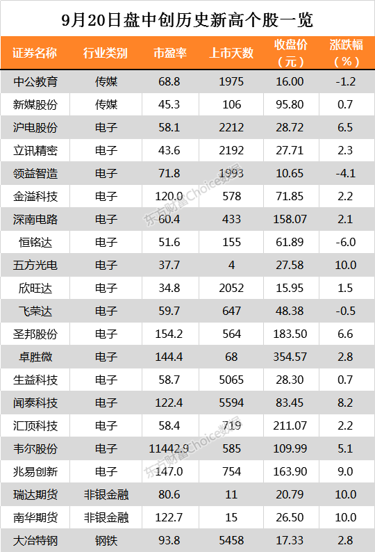 9月20日,沪指收报3006.45点,涨0.24%。板块方面,高铁、交运设备等板块领涨两市。东方财富Choice数据显示,今日有42只个股盘中股价创历史新高,个股包括沪电股份、立讯精密、领益智造、深南电路、白云机场、贵州茅台、通策医疗等。