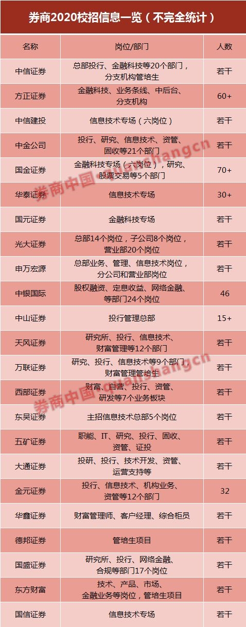 近日,中信证券全面开启了2020年校园招聘计划,加上之前率先开启校园招聘的华泰证券、国信证券、国金证券、德邦证券等机构,已有共计20余家券商加入了优质人才的抢夺战中。