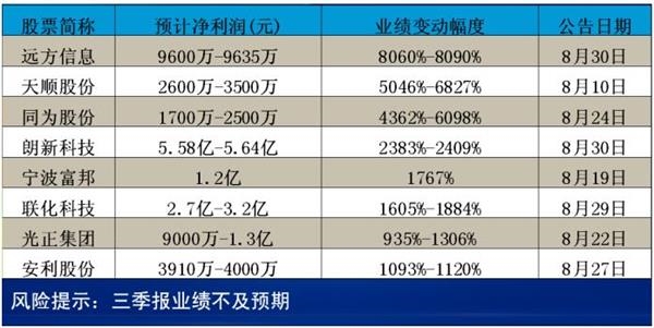 在134家预增的公司中,有8家三季报业绩增长10倍,其中远方信息预计三季报净利润9600万元-9635万元,同比增长8060%-8090%,位居榜首;其次是天顺股份预增5046%-6827%,第三是同为股份预增4362%-6098%。此外还包括朗新科技、宁波富邦、联化科技、光正集团和安利股份。值得一提的是,上述8只个股今日全线翻红,其中远方信息、天顺股份和光正集团三只个股盘中涨停。