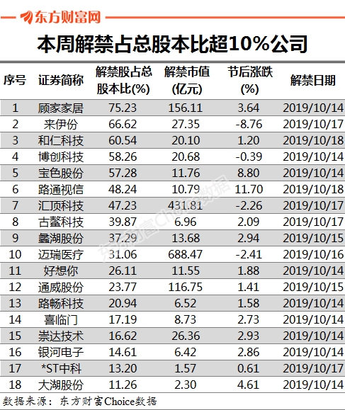18股解禁占总股本比超10%