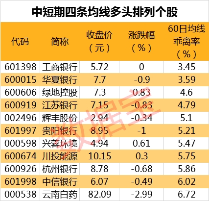 统计显示,截至10月16日,128只个股5日、10日、20日、60日四条均线近日呈多头排列。其中工商银行、华夏银行、绿地控股股价与60日均线的乖离率最小,分别为3.45%、3.59%、4.6%。