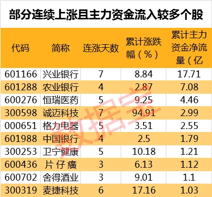 值得注意的是,190只连续上涨个股中,10只个股期间主力资金累计净流入超过亿元。其中,累计资金流入最多的为兴业银行,主力资金累计流入17.71亿元。