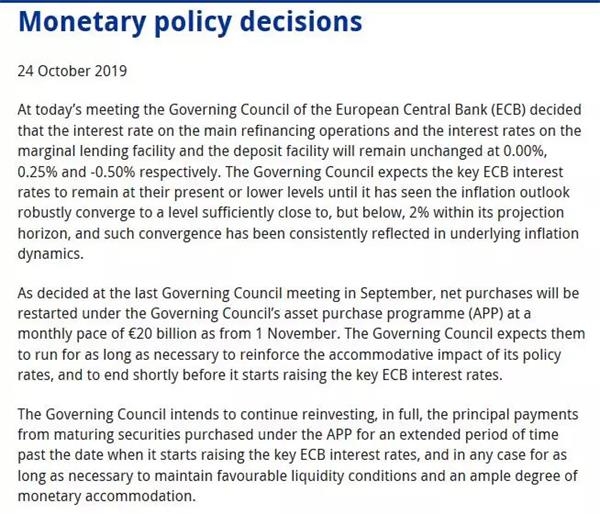10月24日,欧洲央行表示,将主要再融资利率在0%不变,存款机制利率在-0.5%不变,边际借贷利率在0.25%不变,均符合预期。预期利率将维持在当前或者更低水平,直至通胀前景稳固转向接近但低于2%的目标水平;重申自11月1日起重启净资产购买计划,规模为每月200亿欧元(折合人民币约1570亿元),并且将在加息前不久停止购债。