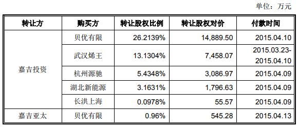 2015年3月19日,嘉吉的子公司将嘉必优49%的股份进行转让,受让方为武汉烯王、贝优有限、湖北新能源、杭州源驰、长洪上海,合计金额为2.78亿元。