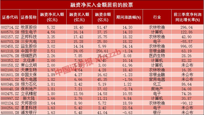 具体到个股来看,1636只有两融交易记录的股票中,有868只股票获融资净买入,占比过半。其中,融资净买入过亿元的股票达38只,净买入额居前5位的股票中有3只猪产业股票。牧原股份、正邦科技、益生股份分别获融资资金净买入5.32亿元、3.35亿元和3.02亿元,6日内股价涨幅分别达到14.3%、18.32%和34.14%。这三家公司均已公布三季报,业绩喜人。益生股份和牧原股份前三季度归母净利润增幅分别高达996.05%和296.04%,正邦科技净利润也同比增长了42.9%。光大证券研究认为,猪肉价格快速上涨对消费抑制并不显著,猪肉占生活成本比例不高,具有一定必需品属性。考虑供需关系,后续猪价仍有上涨空间。猪肉涨价将对猪肉股业绩构成长期支撑。