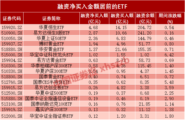 此外值得一提的是,10月18日刚被上交所纳入融资融券标的的华宝中证科技龙头ETF也颇受融资客欢迎,累计融资净买入达1.02亿元。华宝中证科技龙头ETF近6日累计上涨6.42%,涨幅在两融标的ETF中位居前列。分析人士认为,随着创新驱动国家发展战略的不断深入,科技板块发展前景可期,纳入两融标的的科技ETF有望持续受益。
