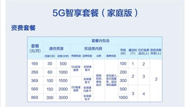 此外,中国移动推出5G套餐家庭版,家庭版每月分169元、269元、369元、569元、869元五个档,流量从30GB到300GB不等。根据套餐资费,宽带速度从100M到1000M不等。