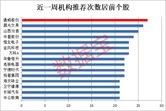 从个股来看,获机构推荐次数超过20次的有15家公司。其中通威股份获得买入推荐次数最多,有27次,公司三季报显示,前三季度实现营业收入280.25亿元,同比增长35.24%;归母净利22.43亿元,同比增长35.24%。浙商证券指出,该公司多晶硅料、单晶PERC电池片业务2020年有望迎来量价齐升,业绩拐点已现。获机构推荐次数较高的还有晨光文具、山西汾酒、中直股份、恒生电子等。