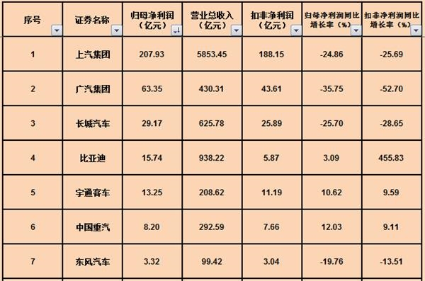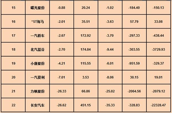 记者梳理发现,22家整车企业归母净利润合计为276.73亿元,其中上汽集团以207.93亿元排行榜首,广汽集团63.35亿元次之,两者之和为271.28亿元,占22家车企归母净利润之和的98.03%,力帆股份、长安汽车则分别以亏损26.33亿元、亏损26.62亿元排名垫底。
