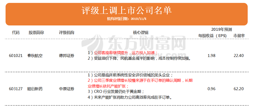 11月4日,春秋航空、昭衍新药股票评级被调高。与此同时,彤程新材、海澜之家等25家被首次覆盖。