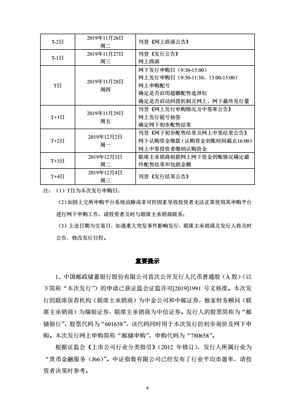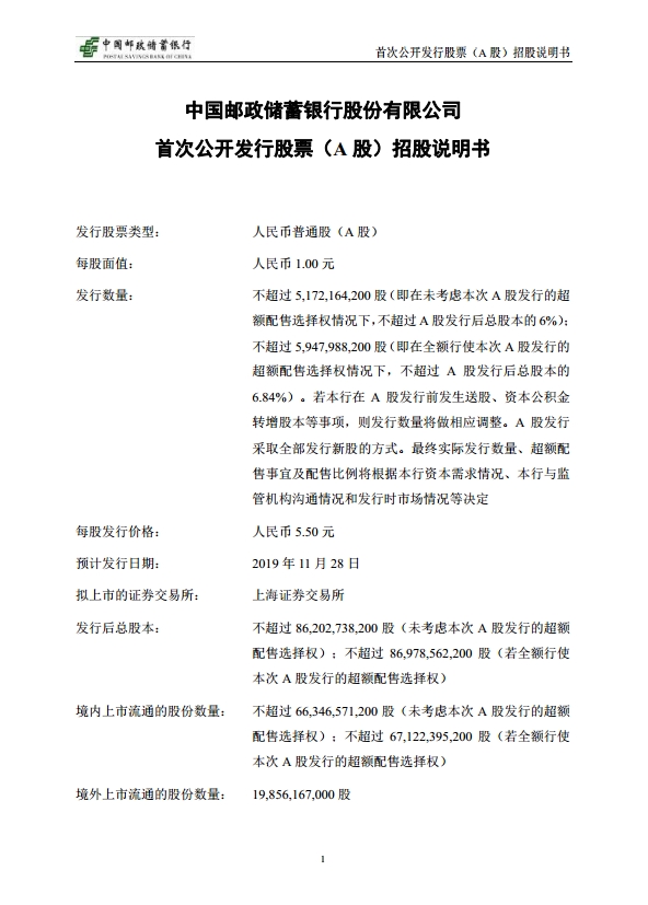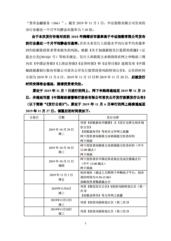 11月6日,邮储银行在上交所发布公告称,根据市场化询价结果,该行A股IPO价格确定为5.50元/股。由于该发行价格对应的2018年摊薄后市盈率(9.58倍PE)高于中证指数有限公司发布的A股银行业最近一个月平均静态市盈率(7.10倍PE,截至11月1日),需要连续刊登三周风险提示公告,网上、网下申购将按规定递延至11月28日,网上路演也按规定相应递延至11月27日。