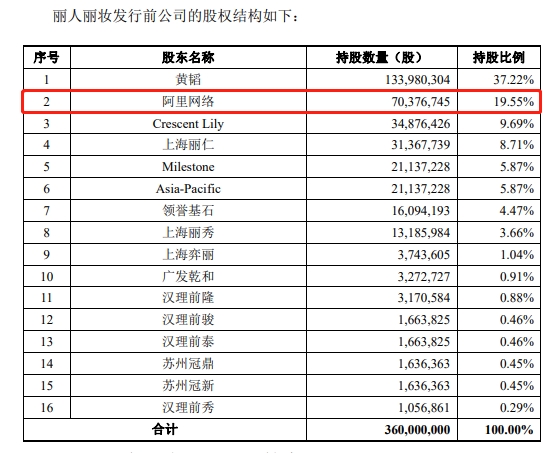 作为一家业务集中在电商平台的化妆品零售企业,丽人丽妆招股说明书显示,公司控股股东为黄韬,持有1.34亿股公司股份,持股比例为37.22%;阿里网络持有公司0.70亿股股份,持股比例为19.55%,系公司第二大股东。