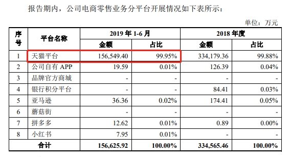 丽人丽妆的“阿里依赖”不仅体现在资本端。公司预先披露的招股说明书显示,天猫平台几乎成了公司赖以开展业务的唯一电商平台。2019年1至6月,公司在天猫平台形成的业务金额为15.65亿元,占上半年公司总业务金额的99.95%,而其他诸如亚马逊、蘑菇街、拼多多、小红书、公司自有APP等电商平台仅分得剩余的0.05%。综合2016年至2019年上半年来看,丽人丽妆各年在天猫平台产生的业务金额均占到当年总额的99%以上。