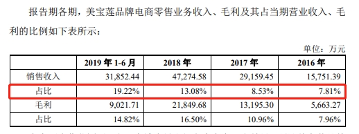 一个更坏的消息是,在丽人丽妆2019年1-6月销售收入中占比最高的品牌和公司的合作也发生了变更。2019年8月起,美宝莲品牌由授权丽人丽妆运营美宝莲品牌官方旗舰店,变更为授权公司通过丽人丽妆官方旗舰店销售美宝莲产品。公司招股说明书显示,美宝莲品牌2016年至2019年1-6月零售收入占当期营业收入的比例分别为7.81%、8.53%、13.08%、19.22%,是当前公司合作的60多个品牌中名副其实的“台柱子”。对此情况,丽人丽妆表示,变更合作范围后,由于店铺流量和知名度存在一定差异,预计美宝莲品牌电商零售收入及毛利将出现下降。