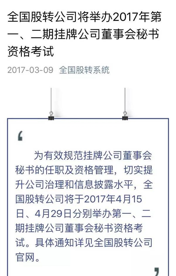 股转系统通知显示,将于2017年4月15日、4月29日分别举办第一、二期挂牌公司董事会秘书资格考试,接受挂牌公司和申请挂牌公司董事会推荐人员报名。每期考试每家公司限推荐一人报名。
