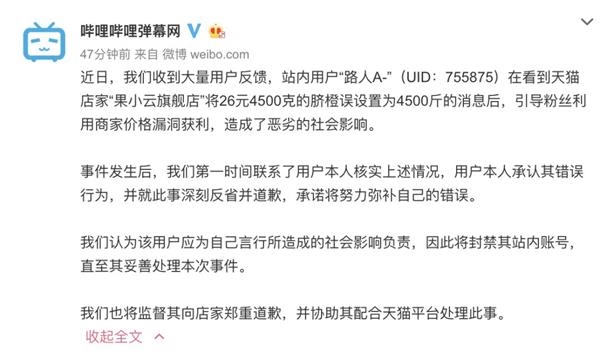 随后,哔哩哔哩官方微博@哔哩哔哩弹幕网也对此事作出回应,表示将封禁其站内账号,直至其妥善处理本次事件。同时,也将监督其向店家郑重道歉,并协助其配合天猫平台处理此事。