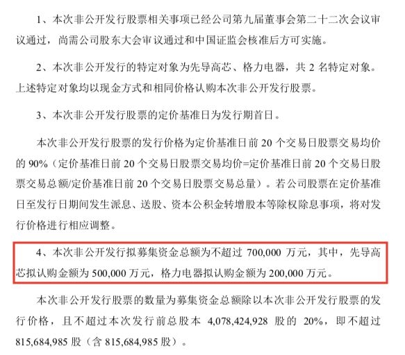 三安光电今日披露的2019年度非公开发行A股股票预案显示,拟募集资金总额为不超过70亿元。其中,关联方长沙先导产业投资有限公司旗下有限合伙企业拟认购50亿元,格力电器拟认购剩余20亿元。