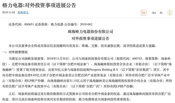 在2018年底董明珠宣称将涉足芯片产业之时,格力电器便与A股上市公司闻泰科技展开合作,出资30亿元参与闻泰科技收购Nexperia Holding B.V(简称“安世集团”)项目。