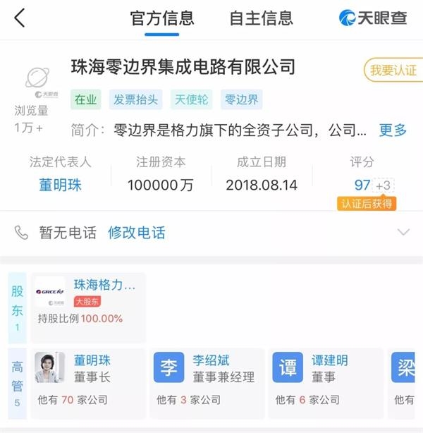 2018年8月14日,一家名为“珠海零边界集成电路有限公司”的公司注册成立,注册资本为10亿元,格力100%控股,法定代表人董明珠。格力电器副总裁兼董秘望靖东随后确认,该公司确系格力电器刚刚注册,主业是空调的芯片设计,同步还会发展一些相关业务。