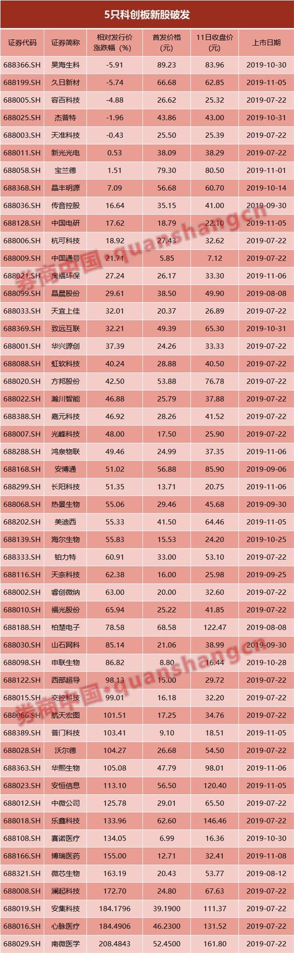 据记者统计,截至11月11日收盘,在科创板上市的51只新股中,已有5只跌破发行价,分别是昊海生科、久日新材、容百科技、杰普特以及田准科技,相对发行价的涨跌幅分别为-5.91%、-5.74%、-4.88%、-1.96%、-0.43%。