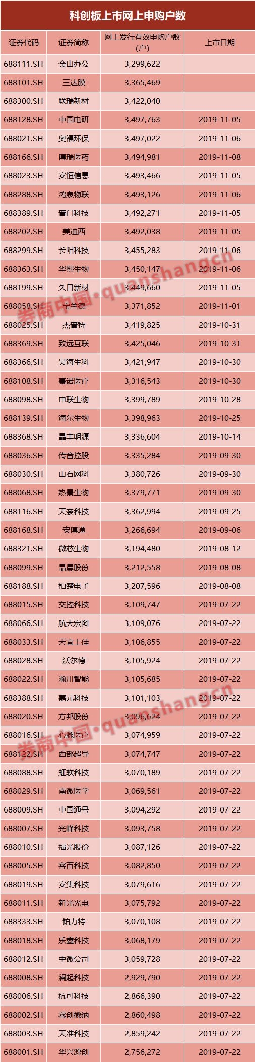 11月以来上市科创板股票共有11只,就网上申购户数来看,除了蓝士德337.19万户以外,其他10只股票的均超过340万户,均高于此前所有上市的科创板股票的申购量。