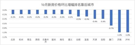 而10月的17个新房价格环比下降城市中,跌幅最大的则是济南和泸州。作为一线城市的北京也进入了“十大领跌”之列。
