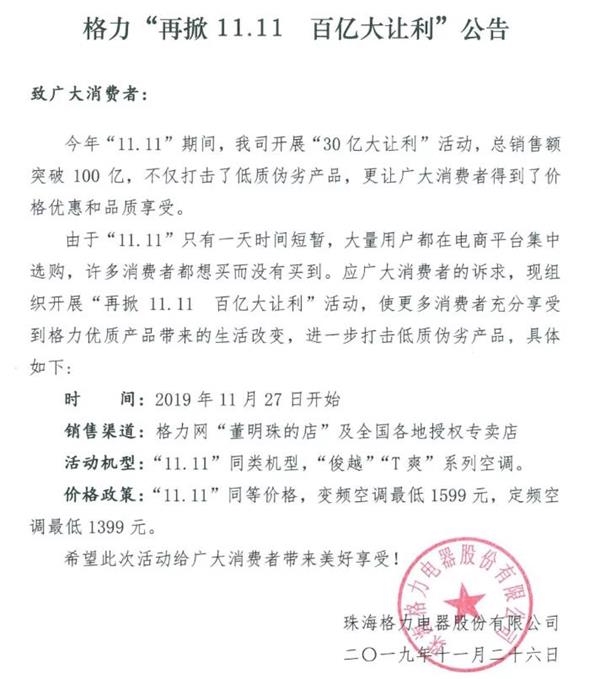 格力电器:“再掀11.11 百亿大让利”活动 进一步打击低质伪劣产品