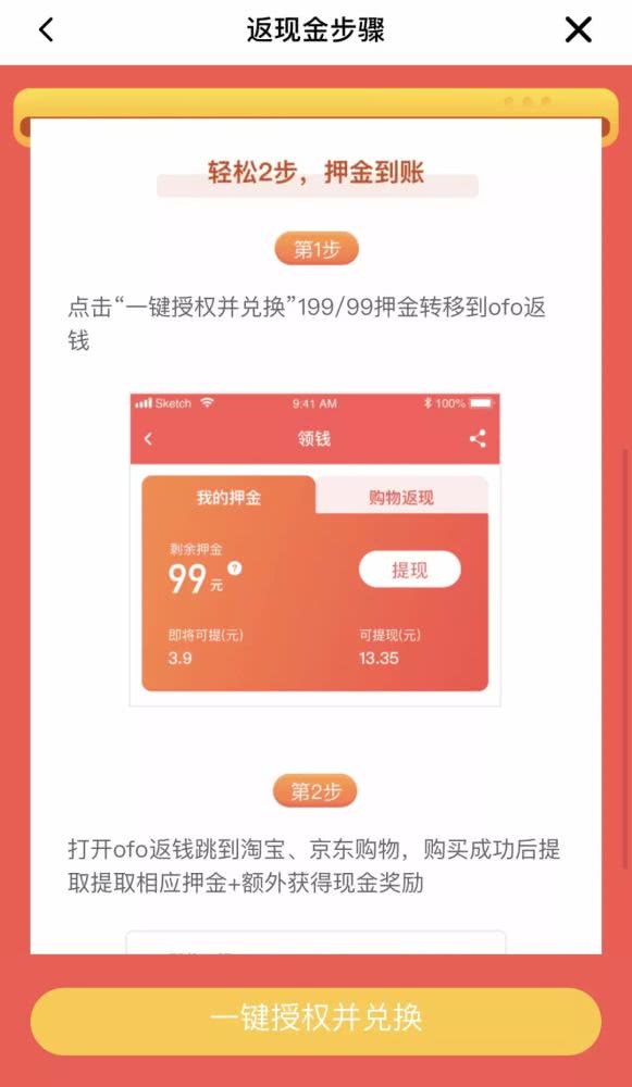 第一步,点击“一键授权并兑换”199/99押金转移到ofo返钱;