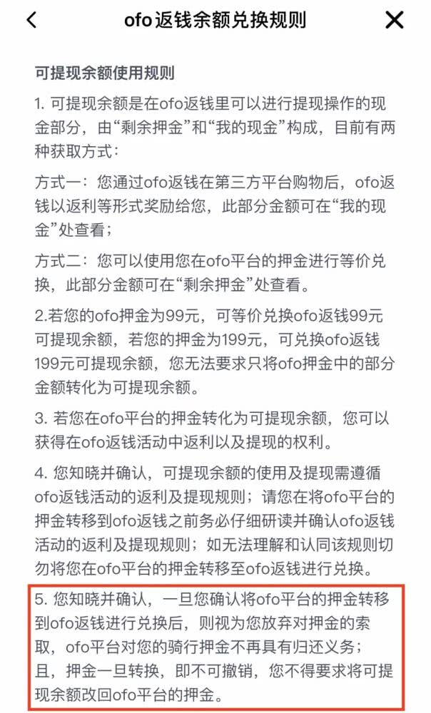 要拿回押金并没有这么容易。根据“ofo返钱”的兑换规则:“一旦用户授权同意参加活动,押金转为”ofo返钱“的同等账户余额,兑换之后,视作对用户放弃对押金的索取,ofo平台对骑行押金不再具有规划义务。且押金一旦转换,即不可撤销,不得要求将可提现余额改回ofo平台押金。”