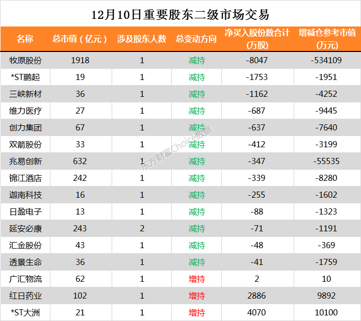 12月10日,两市共有16家公司公告进行重要股东二级市场交易。其中牧原股份净减持8047万股,减仓参考市值为534109万元。