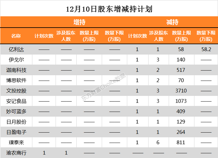 12月10日,两市共有11家公司公告股东减持计划,包括文投控股、安记食品等。