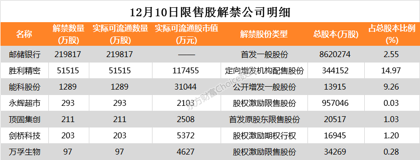12月10日,两市共有7家公司限售股解禁,具体解禁公司包括胜利精密、能科股份等。其中胜利精密解禁可流通股数量为5.15亿股,占其总股本比例为14.97%。