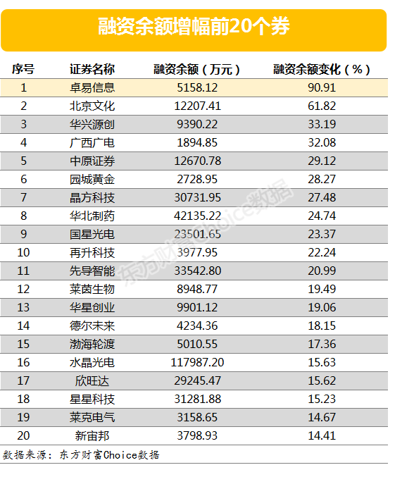 融资余额增幅最大的是卓易信息,该股最新融资余额5158.12万元,较前一交易日增长90.91%。另外,融资余额增幅较大的还有北京文化、华兴源创等,增幅分别达61.82%、33.19%。