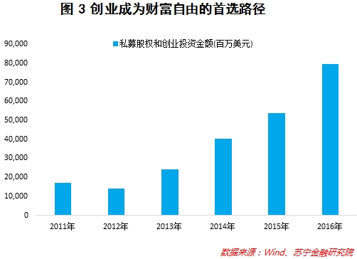 从数据上看,越来越多的人开始选择创业作为实现财富自由的途径。以私募股权和创业投资金额为例,2016年投资金额794亿美元,同比增加47%,达到了历史新高水平(参见图3)。改革开放后不断的财富累积,以及新的消费群体和消费理念的出现,使得消费等需求得到充分的释放,配合上国家鼓励大众创业,创业面临细分化需求和国家政策的双重支撑。