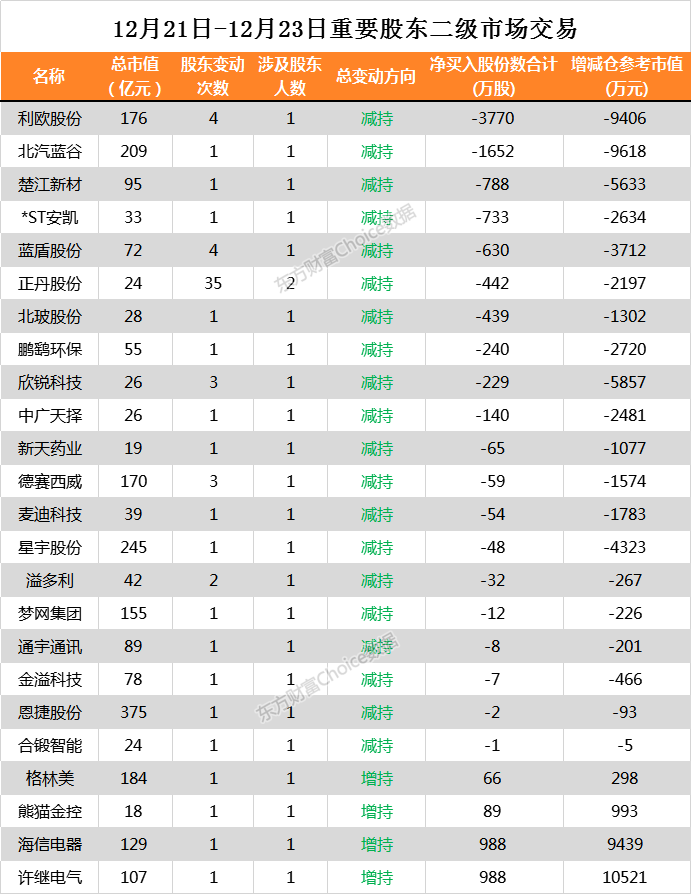 12月21日-12月23日,两市共有247家公司公告进行重要股东二级市场交易。其中利欧股份净减持3770万股,减仓参考市值为9406万元。