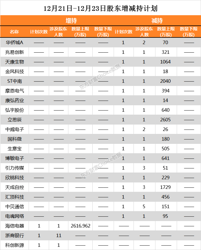 12月21日-12月23日,两市共有22家公司公告股东减持计划,包括ST中南、天成自控等。