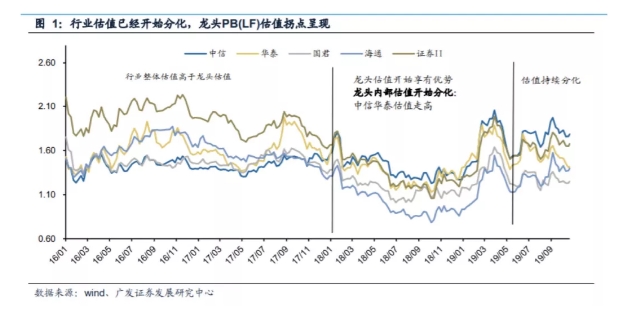 确实,如果单从绝对数据来比较,上市券商龙头的估值溢价并不突出;但如果从变化趋势来看,你会发现上市券商的龙头溢价体现本身已经是个从无到有的历程。结合广发证券整理的这张图表:过去中小券商估值高,行业整体估值高于龙头估值;2018年前后龙头溢价逐步得到体现。