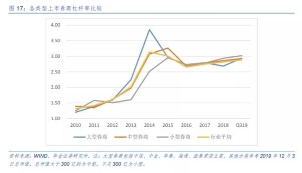 而从华金证券的分类比较来看,至少在资本冗余这个问题上,大型券商的杠杆率与行业平均大致相当,2018 年末甚至低于行业平均(2013-2014 年大型券商杠杆率较高,主要因为有一家大型券商尚未上市,因此待其2015年上市融资后,杠杆率随即降低)。