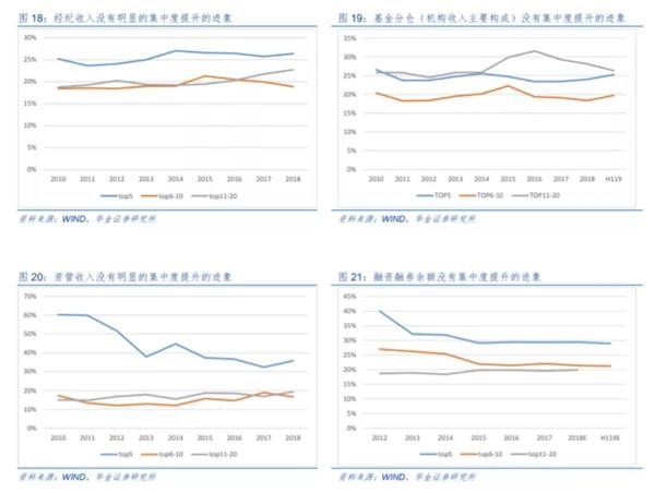 除此之外,受业务/产品同质化的困扰,券商行业的经纪(含机构业务)、两融、资管等传统业务竞争依然激烈,以下图中的华金证券报告数据为例,集中度显著提高的迹象也不明显。