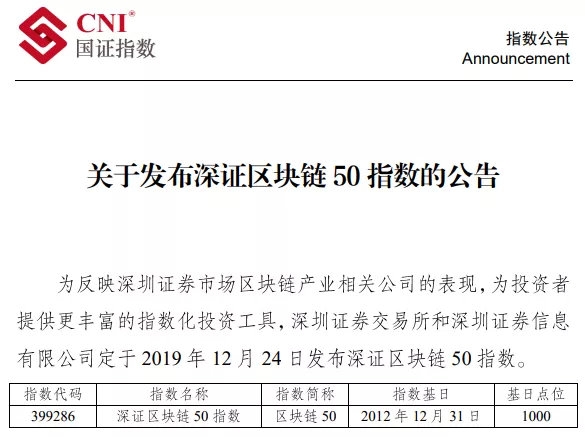 12月24日,深交所在其官网发布公告称,为反映深圳证券市场区块链产业相关公司的表现,为投资者提供更丰富的指数化投资工具,深圳证券交易所和深圳证券信息有限公司定于2019年12月24日发布深证区块链50指数,指数代码为399286。