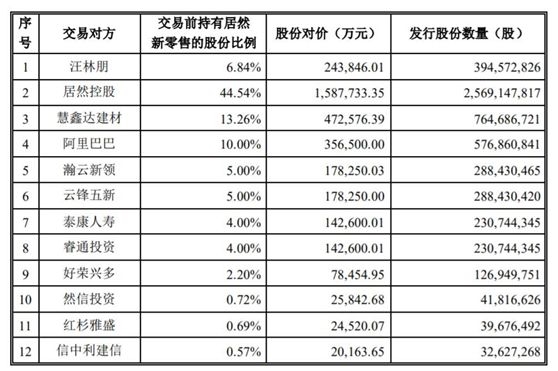 这一次借壳的具体交易中,武汉中商发行股份购买居然新零售100%的股权,交易作价356.5亿元,交易完成后,居然控股将直接持有上市公司42.60%的股份,并通过其全资子公司慧鑫达建材间接持有12.70%股份,成为上市公司的控股股东,同时,上市公司实控人由武汉国资委变更为汪林朋。