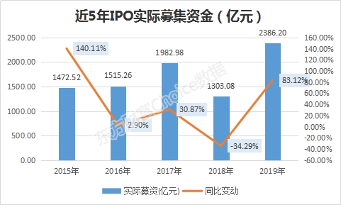 我们先来看看新股募资情况,东方财富Choice数据显示,截至2019年12月26日,年内共有201只新股首发上市,较去年的103家,增长95.1%;首发实际募集资金2386.2亿元,较2018年的1303.08亿元,增长83.1%。