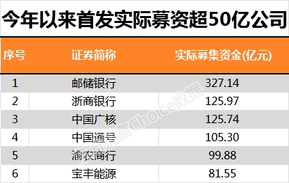 募集资金大幅攀升的原因,一方面是IPO加速,另一方面也与年内多家银行IPO有关。东方财富Choice数据显示,年内实际募集资金超过50亿的公司有6家,最高的邮储银行达327.14亿元,超过2015年国泰君安的300.58亿元,成为近5年最大的IPO。此外,浙商银行为125.97亿元,渝农商行为99.88亿元。