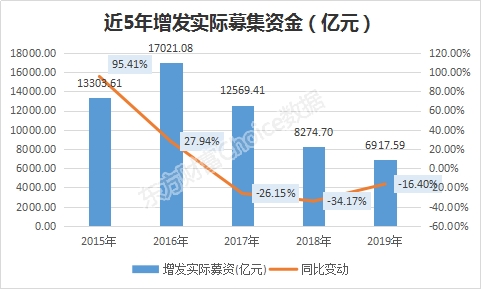 关于增发,东方财富Choice数据显示,2019年以来,已有242家公司进行增发,增发实际募资6917.59亿元,较2018年的8274.7亿元减少16.4%。