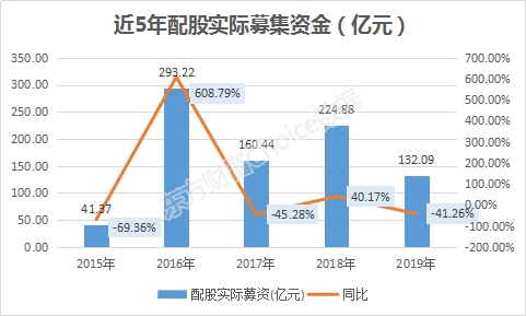 2019年以来,已有9家公司进行配股,较2018年的15家减少4成。通过配股实际募资资金132.09亿元,较2018年的224.88亿元减少41.3%。