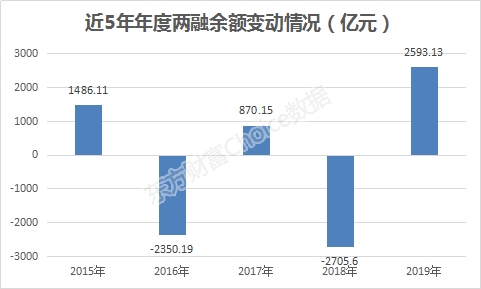 截至2019年12月26日,东方财富Choice数据显示,沪深两市两融余额为10150.17亿元,较2018年底的7557.04亿元,增加2593.13亿元。而2018年则是减少的,为2705.6亿元。