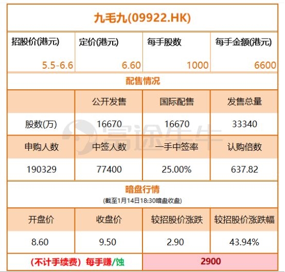 据富途证券数据显示,在此前的公开发售阶段,共有190329人参与九毛九的公开配售,一手中签率25%,认购倍数637.82倍,在随后的富途暗盘交易中九毛九收涨43.94%,每手赚2900港元,成为今年港股市场首个“肉签”。