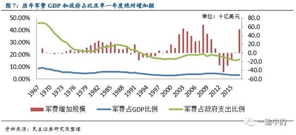 历史角度来看,特朗普此次军费扩张幅度并非最高,如1979-1982年的军费增幅平均为15%,就绝对规模而言,历史上仅2003年和2008年的增加额度大于此项计划。