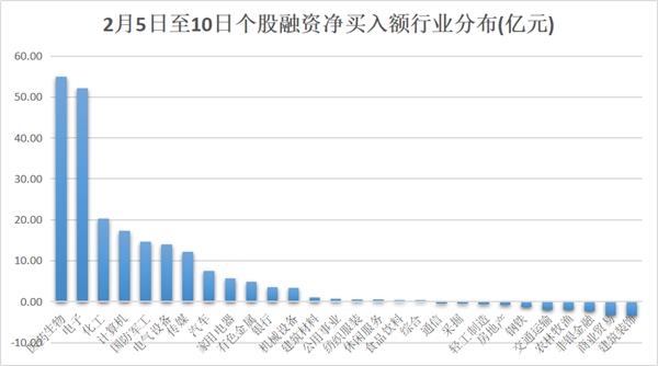 从融资客加仓方向来看,28个申万一级行业中,18个行业获融资客加仓,10行业遭弃。其中,医药生物和电子行业分获融资净买入54.91亿元和52.08亿元,二者合计占全部个股融资净买入额比例接近六成,近期融资客对于医疗、科技等个股的青睐可见一斑。化工行业融资净买入额为20.25亿元,计算机、国防军工、电气设备、传媒也均获得10亿元以上的融资净买入。