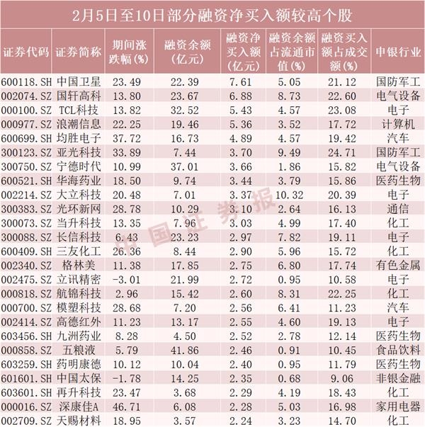 个股方面,融资余额四连升期间,两市共有826只股票获融资净买入,其中473只获融资净买入超1000万元,182只融资净买入超5000万元,98只融资净买入超过1亿元。中国卫星、国轩高科位列前二,融资净买入额分别为7.61亿元、6.88亿元;TCL科技、浪潮信息、均胜电子排在其后,分获融资净买入5.43亿元、5.36亿元、4.89亿元;亚光科技、宁德时代、华海药业、大立科技、光环新网、当升科技融资净买入额也均超过3亿元。